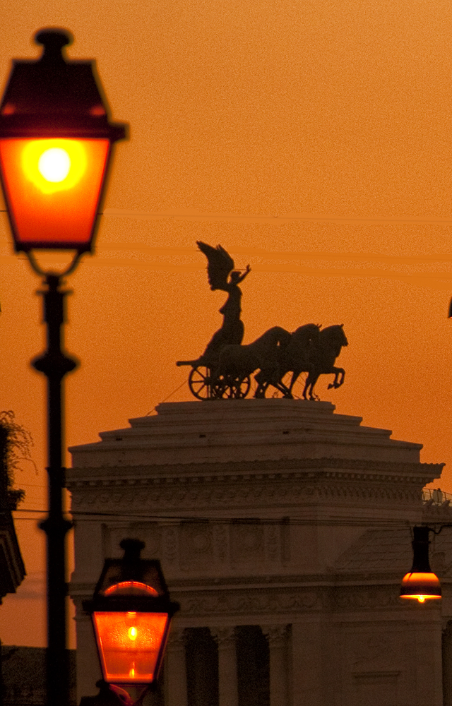 Ma oggi era bellissima!!!! La Quadriga dell’Altare della Patria (sì, la macchina da scrivere) nel tramonto e con i lampioni era superba!!