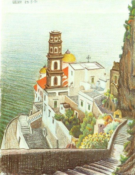 Più volte mi sono soffermato sulla presenza di Escher ad Atrani. Famose le sue Metamorfosi che comprendono la punta di tale borgo.