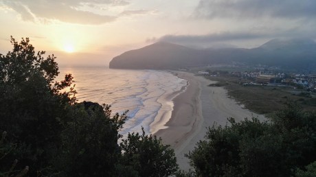 Arrivo su un punto esposto, stranamente senza vegetazione e…. voi umani non avete mai visto le cose… a destra il sole che sorge sulla spiaggia di Santoña, a sinistra la spiaggia di Noja che riceve i primi raggi di sole…