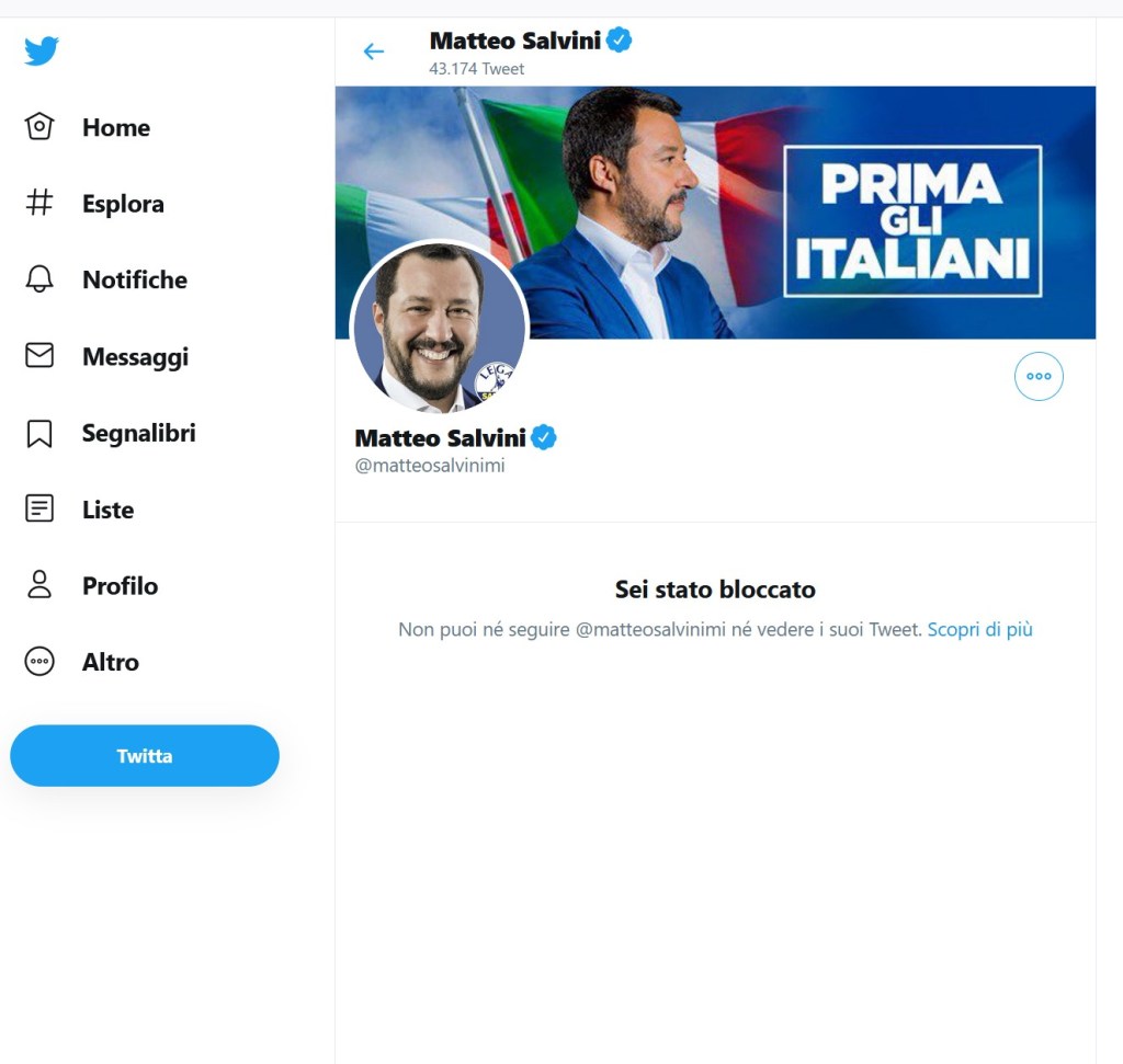 Eppure Salvini mi ha bloccato su Twitter. Badate bene, non sono stato bloccato da Twitter per violazione delle sue regole [violenza, nudo, incitazione all’odio, ingiuria, etc.], sono stato bloccato proprio da Salvini o da chi gestisce il suo profilo su Twitter (@Matteosalvinimi). E’ un suo diritto, non posso negarglielo, come nego che i miei tweet [sono pubblici, potete controllare sul mio profilo] possano aver violato le regole di Twitter che, infatti, non mi ha bloccato.
