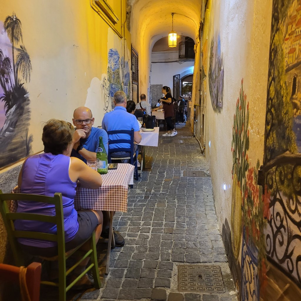 Queste sono due fotografie del vicolo di Santa Maria de domno, vicolo stretto, ma importante perché mette in comunicazione la parte bassa (lungomare) di Salerno con la parte alta (centro storico). Come si vede, non si riesce neppure a camminare. E c’è di peggio: le fotografie non rendono l’inquinamento acustico derivante dalla musica a palla diffusa (chissà perché) dai gestori dei ristoranti. Anche il riposo notturno è precluso.