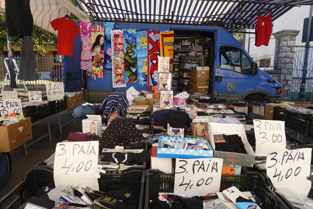 Stamattina ci ho fatto un giro. Preponderanti i banchi di vestiario e di scarpe. Tanto assortimento, qualità non eccelsa, ma prezzi modici. Specialmente intimo: mutande, reggiseni, maglie intime, calze, calzini. Ma anche coltelli, attrezzi per l’orto e l’agricoltura; articoli per la casa, lenzuola, tende per la doccia, spugne, detersivi.