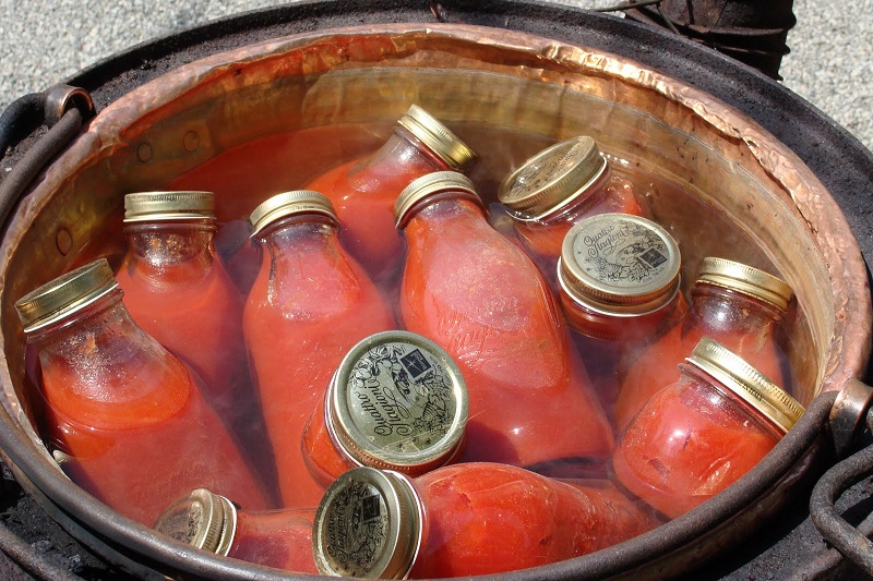 Poi ci sono gli articoli stagionali: oggi c’erano due banchi che offrivano agli acquirenti tutto ciò che può servire per le conserve di pomodoro. La Campania è zona di produzione di pomodoro, una volta i San Marzano, ora gli pseudo San Marzano, l’oro rosso! I bei pomodori oblunghi, rossi rossi. Quindi tappi, bottiglie, tritapomodori, bidoni metallici per cuocere l’ortaggio nelle bottiglie, boccacci, etc. Sì, qui è ancora viva la tradizione di sbollentare i pomodori oblunghi, pelarsi fino a scottarsi le dita, frullarli, metterli nelle bottiglie con un po’ di basilico e sale, tapparle e bollirle in grandi contenitori. Salsa pronta fino all’estate successiva per condire spaghetti e non solo. Tutta la famiglia o, meglio, le donne della famiglia, partecipa alla “funzione”, macchiata di rosso sangue dei pomodori, magari cantando antiche nenie. Vi assicuro che i barattoli di pelati di pomodoro, anche delle migliori marche, non reggono il confronto con queste bottiglie piene di oro rosso confezionate a mano.