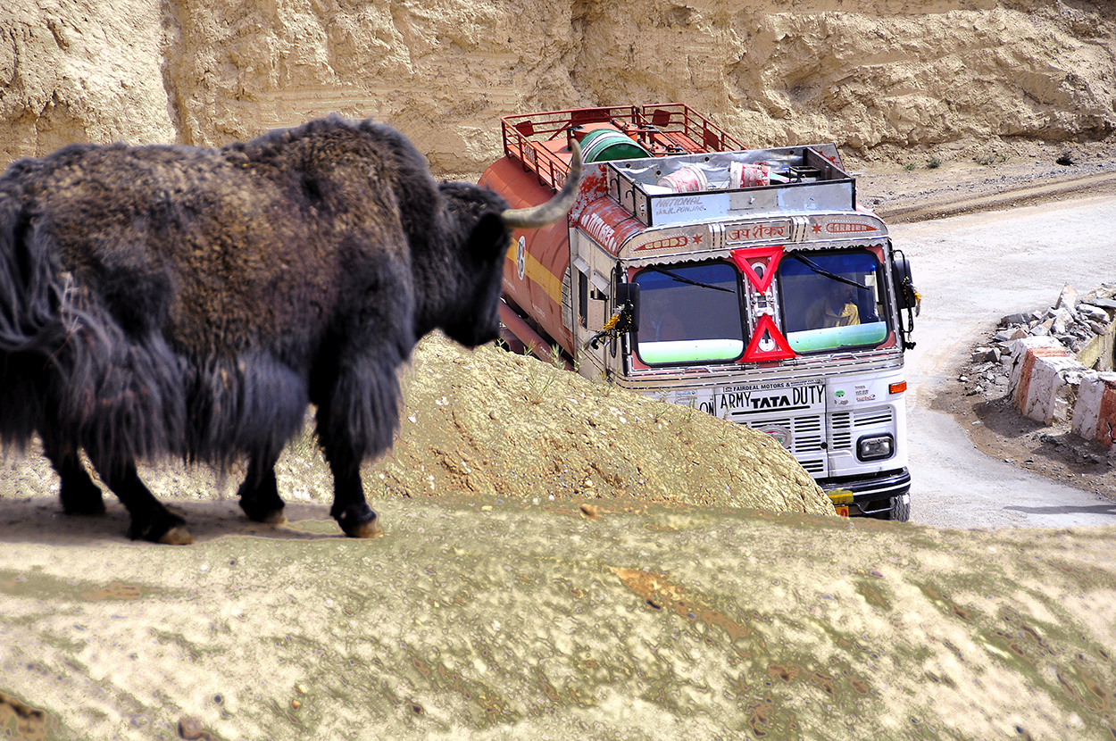 Sulle lunghe, tortuose, sterrate strade montane, dove la media oraria non sale mai sopra i 30Km/ora questi pachidermi sbuffanti e fumosi sono i veri padroni della strada, guardati con attenzione anche dai pacifici yak al pascolo.